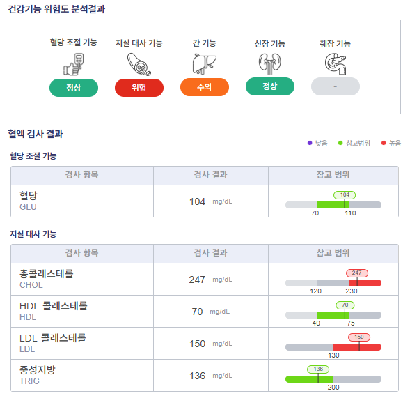 - 9가지 핵심 항목: 간기능(AST, ALT, GGT), 신장기능(Creatinine, BUN), 지질 수치(총콜레스테롤, HDL, LDL, 중성지방), 그리고 당 수치까지 한 번에 확인할 수 있습니다.